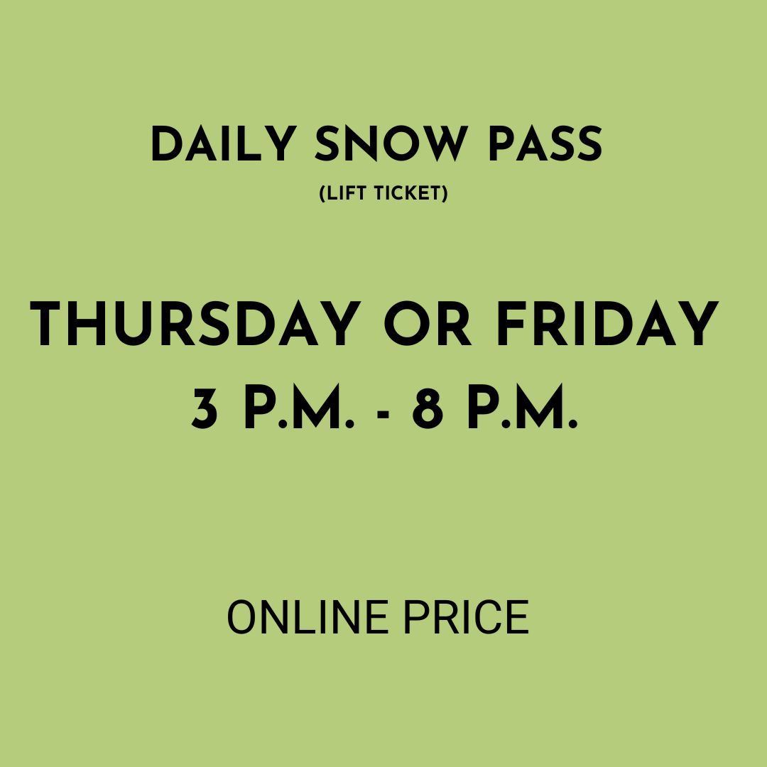 Purchasing: Daily Snow Pass may be purchased online or at the Ticket Window. Online purchase availability will end 2 hours prior to the start of the session.
